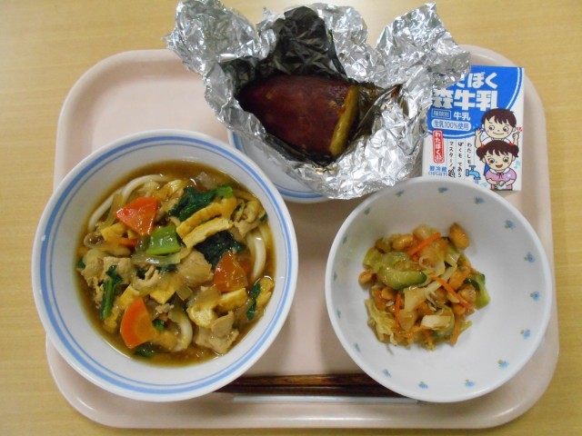 カレーうどん 大豆とじゃこのさらだ  やきいも 牛乳