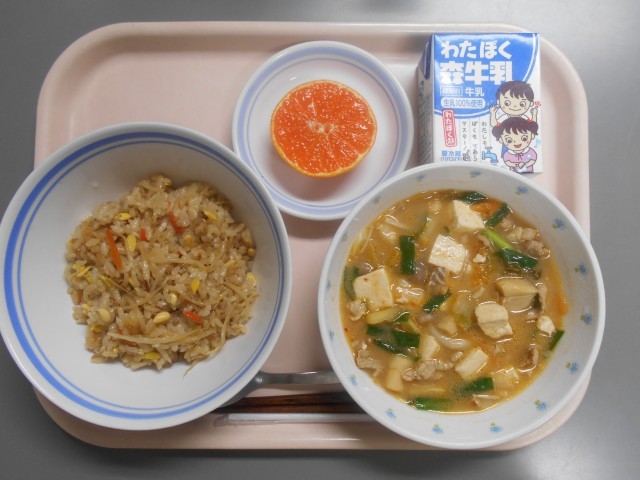 豚肉と豆もやしのまぜごはん スンドゥブチゲ 菊花みかん 牛乳