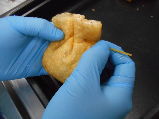 お宝煮は、ウズラの卵やひき肉、ひじきなどの具を一度油揚げにつめ、スパゲティで口を閉じてじっくり煮ました。