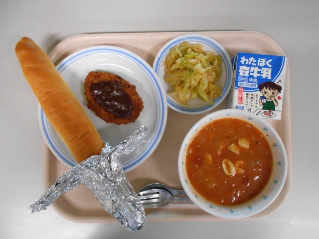 ゆうきのけん(チーズパン) シャークフライ 海の幸いっぱいブイヤベース ゆできゃべつのドレッシングソース 牛乳