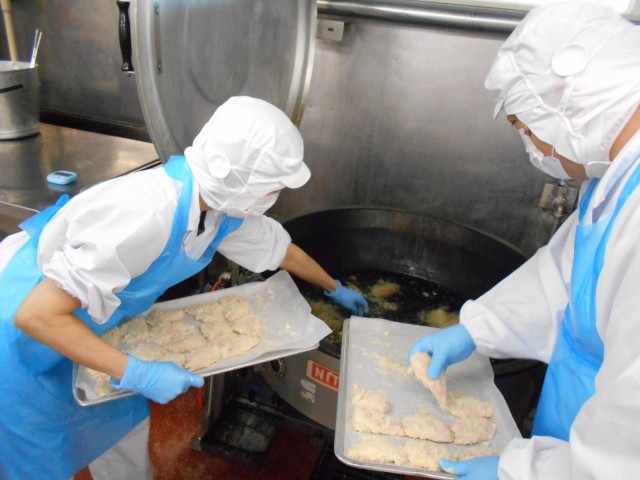 シャーク団 に立ち向かう勇気を持った仲間たちの持つ「剣 けん」 をステック状のチーズパンでイメージしました。劇中の大漁に獲れた海の幸 (タラ、えび、いか)を想像し、うまみたっぷりの ブイヤベーススープを作りました。そして「シャーク(もうかザメ)」は、カラっとフライにしてしまいました!