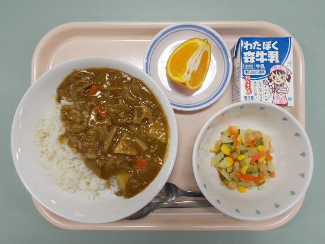根菜のカレーライス ガルバンゾーサラダ いよかん 牛乳