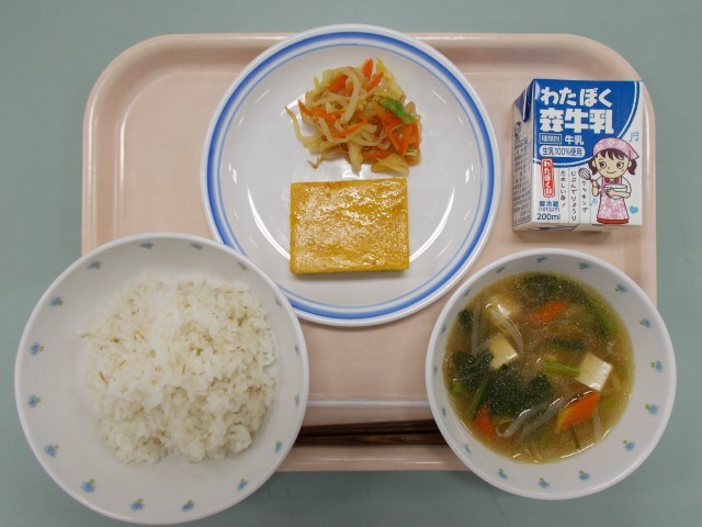 ご飯 中華スープ 中華風卵焼き ゆで野菜のしょうがじょうゆがけ 牛乳