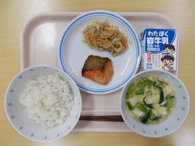 ごはん かきたま汁 さけの西京焼き もやしの甘酢煮 牛乳