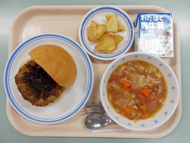 ハンバーガー ミネストローネ カントリーポテト 牛乳
