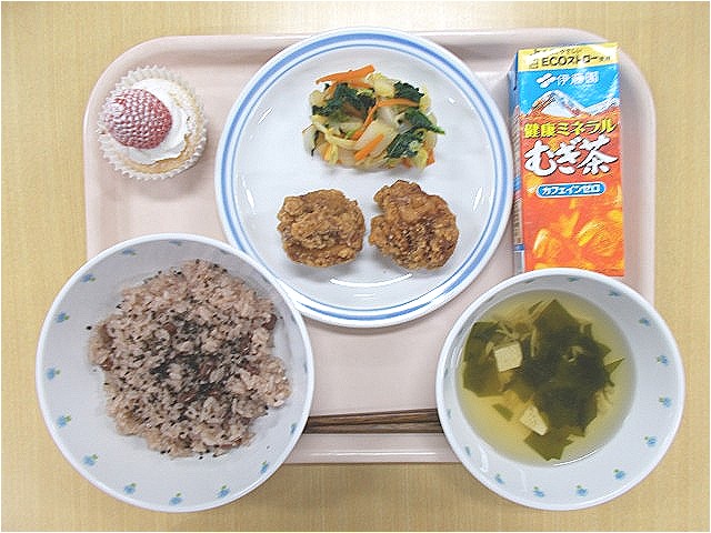 赤飯・ゴマしお すまし汁 からあげ お浸し お楽しみデザート 麦茶