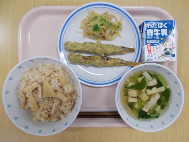 たけのこご飯 すましじる ししゃものいそべあげ ゆで野菜のしょうがじょうゆがけ 牛乳