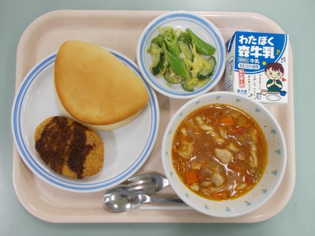 コロッケ・パン ミネストローネ スナップえんどうのサラダ 牛乳