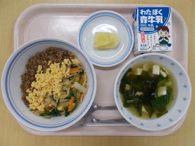 ビビンバ わかめスープ ピーチアップル 牛乳