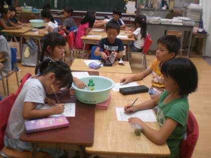 いろいろな容器が表示どおりの容量になっているか確かめています。