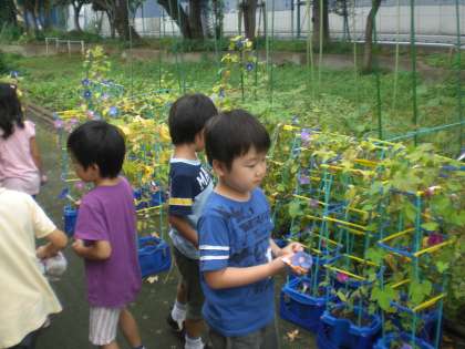 あさがおの花を観察してカードに書いています。
