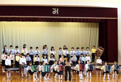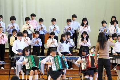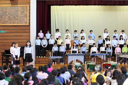 12月2日(金)の午前、めぐろパーシモンホール大ホールで行われる目黒区立小学校連合音楽会に本校5年生が出演します。25日(金)の音楽朝会で全校児童に発表しました,