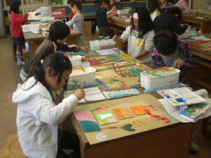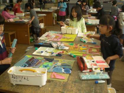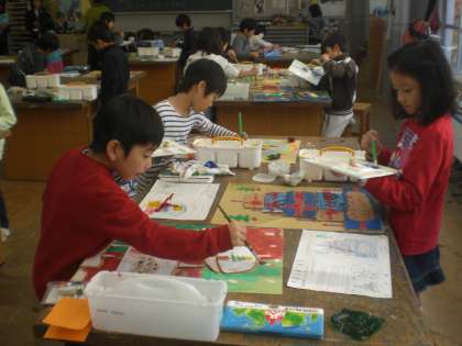 うれしいことやお祝いしたいことがあった時に飾る、おめでとうのケーキがそろそろできあがりそうです。ダンボールやいろいろな材料を利用して、自分の気持ちを込めて素敵なケーキを作っています。