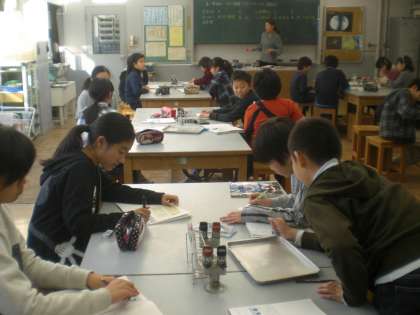 水溶液の性質を調べる学習です。食塩水,塩酸,アンモニア水,炭酸水についてそれぞれの似ているところや違うところを調べました。