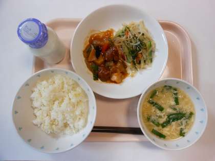 きびごはん ニラ玉スープ むろあじ団子の酢豚風 糸寒天サラダ 牛乳