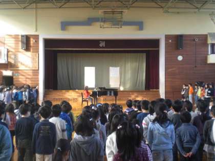 「気球にのってどこまでも」を全校で歌いました。1年生は学芸会で歌った曲だったのでとても上手でした。