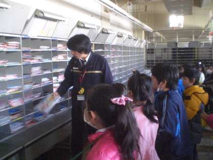 2年 生活 目黒郵便局見学(2) 公開日 2012/02/10 更新日 2012/02/10 2年 実際に自分たちで出したハガキが自動押印機で消印が押される様子や、郵便物あて名読取区分機を通り、仕分けの棚に分けられていく様子、郵便物をトラックに積み込む際のリフトなどを見てきました。 いいね(0)