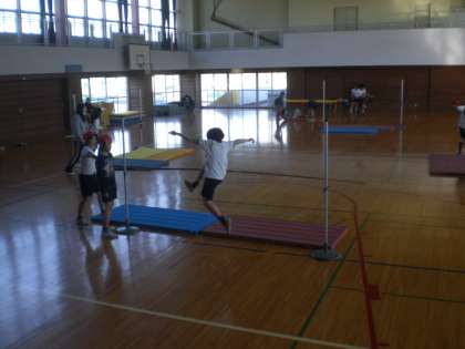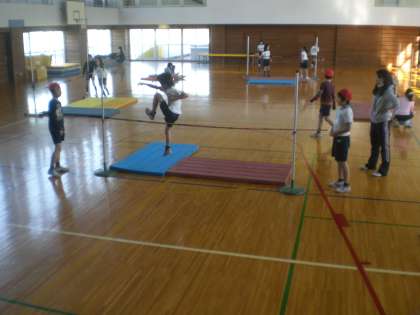 走り高跳びに挑戦しています。走り高跳びは、より高く跳ぶことを競い合う運動です。助走や踏み切りを考えて跳んでいます。