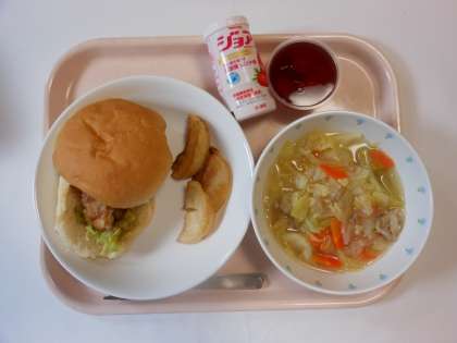 チキン竜田サンド ABCマカロニスープ カントリーポテト グレープゼリー ジャア