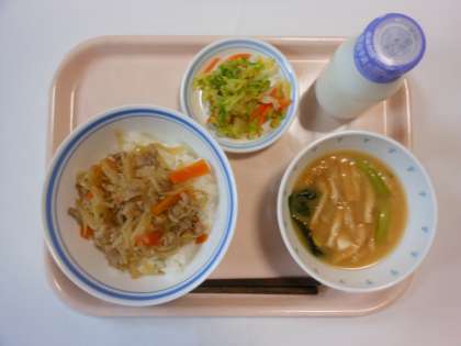 豚丼 豆腐の味噌汁 茹でキャベツのレモン醤油がけ 牛乳