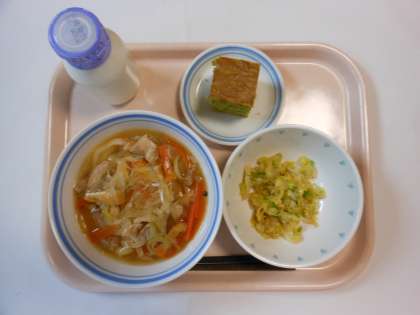鶏南蛮うどん 茹でキャベツのドレッシングソース 抹茶ケーキ 牛乳