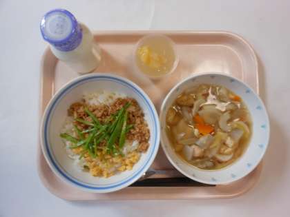 三色丼 のっぺい汁 ピーチゼリー 牛乳