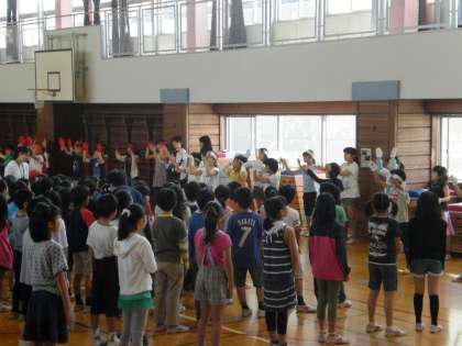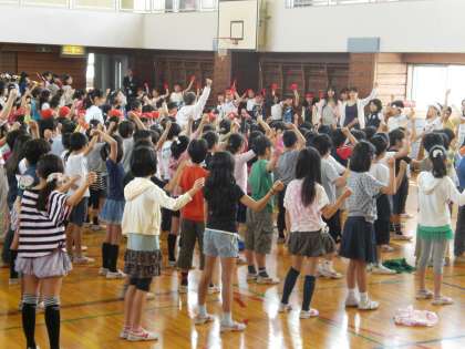 18日(金)の音楽集会では、運動会の歌を練習しました。紅白に分かれて、応援団の威勢の良いかけ声に合わせて、元気よく歌いました。