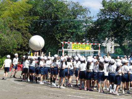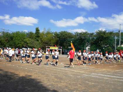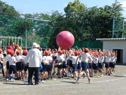 全校で運動会の全体練習をしました。入場行進、大玉送りなどを練習しました。