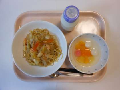 海鮮焼きそば 紅白白玉フルーツポンチ 牛乳