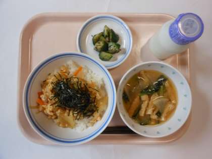 親子丼 大根の味噌汁 きゅうりのゆかり和え 牛乳