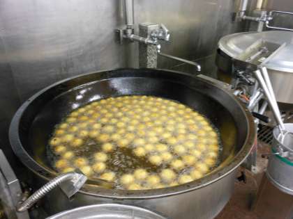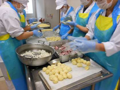 海鮮ポテトは見た目はたこ焼き風ですが、生地はじゃが芋で作りました。じゃが芋は蒸してつぶし、魚介、キャベツ、卵、澱粉を混ぜて丸め、油で揚げました。