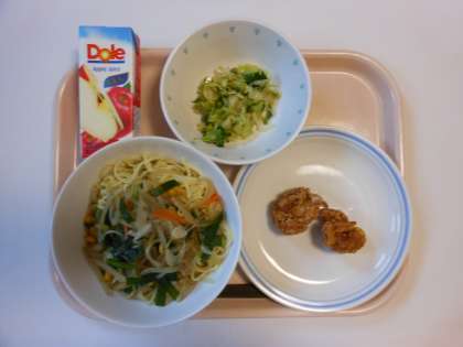 1組2組ともに、鶏の唐揚げが人気でした。どの学年も鶏の唐揚げが1番多くリクエストに挙がります。学校の唐揚げは、火力が強い大釜で揚げるのでカラリと仕上がり美味しいです。また、主食は麺類の希望が多く、野菜たっぷりのラーメンにしました。