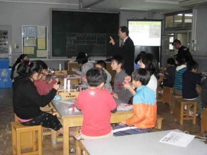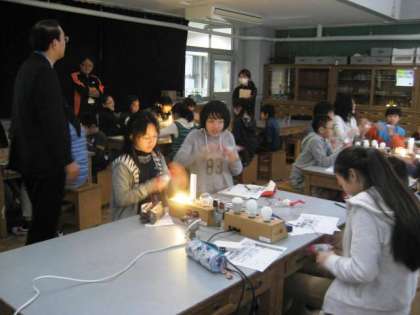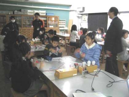 パナソニックの方々をゲストティーチャーとして招き、電気の実験をしました。手回し発電機で、白熱灯、蛍光灯、LEDを点灯させ、どのくらいの電力を消費しているのかを実験で確かめました。