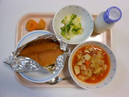 ホットツナサンド 野菜たっぷりスープ ハニーサラダ 牛乳 学校の柿