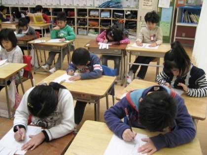 今日は、全校で書き初めを行います。 1年生は、硬筆書写です。お手本をよく見ながら丁寧に書きました。