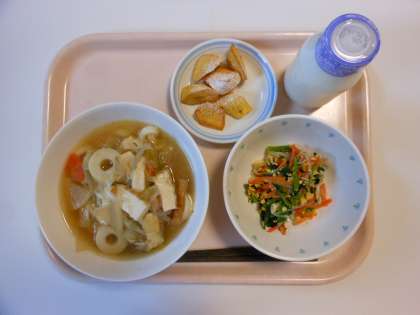 けんちんうどん 千草和え さつま芋の雪景色 牛乳
