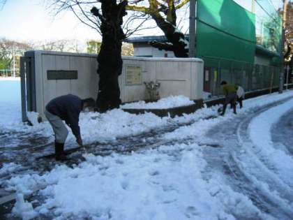昨日降った雪で校庭は真っ白、学校の周りの道路も氷のような雪で覆われていました。