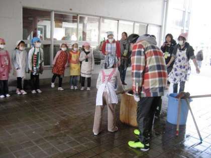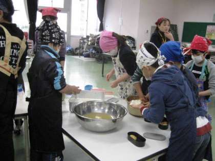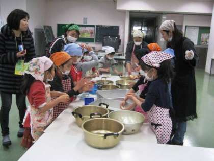 4年生の次は1年生です。1年生にとっては、初めてのもちつきです。つくのも、まるめてきなこやしょうゆをつけるのも、とても楽しんでいました。