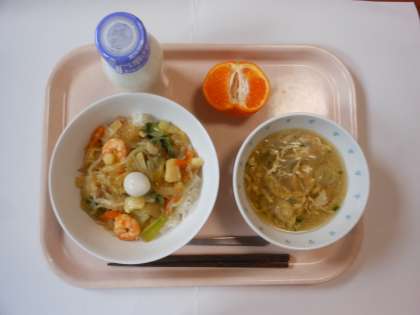 中華丼 卵と春雨のスープ ぽんかん 牛乳