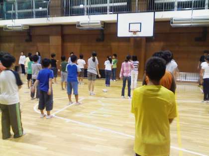 2日め、朝のラジオ体操から始まりました。あいにく雨もようです。