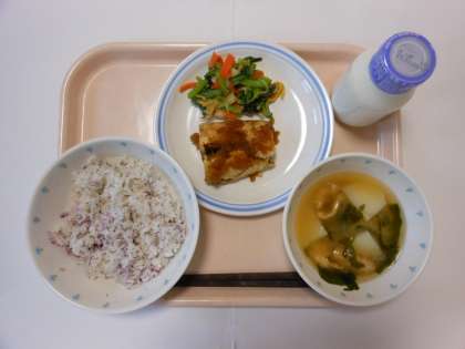 ゆかりご飯 じゃが芋の味噌汁 鯖のおろし煮 ごま和え 牛乳