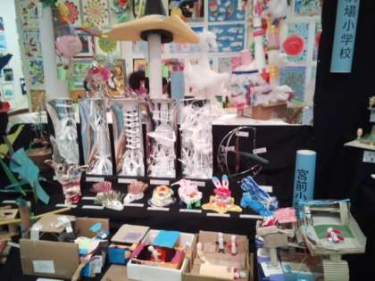 宮前小学校の立体作品です。いろいろな学校の作品があり、楽しいです。四年生みんな真剣に見ています。