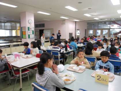 また、4年2組と1年2組でランチルーム給食を行いました。1年生にとっては、初めてのランチルーム給食です。お楽しみデザートは、ポンデリングドーナッツに挑戦しました。もちもち感がでるように工夫しましたが、少し固めの仕上がりになってしまいました。