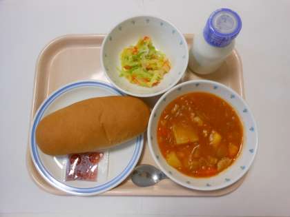 コッペパン ジャム ビーンズトマトシチュー キャベツサラダ 牛乳