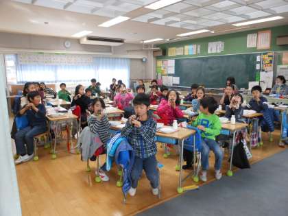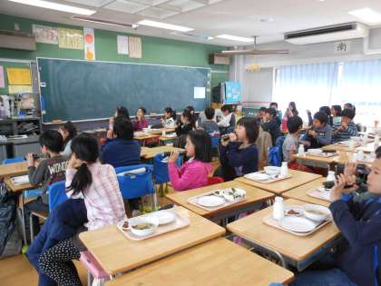 今日は節分で、恵方巻きを食べました。3,4年生の給食風景です。