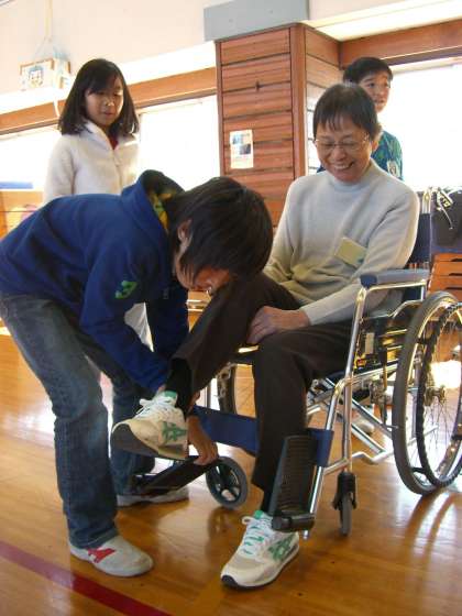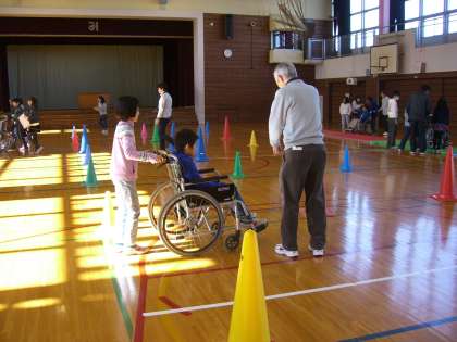 車いすの構造・使い方・注意事項を聞いてから、車いすに乗ったり、車いすを押したりする活動に取り組みました。車いすにとって段差がいかに迷惑なものか、車いすに乗ると、どんなことが怖いのかなど、貴重な体験をすることができました。