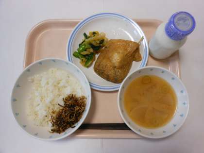 今月の献立には、節分にちなんで豆・豆製品を毎日のように取り入れています。今日は、大豆からできた味噌と油揚げを使いました。大豆は、色々と姿を変えて、多くの食べ方が工夫されています。