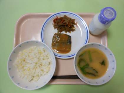 きびご飯 じゃが芋の味噌汁 鯖の味噌煮 五目金平 牛乳