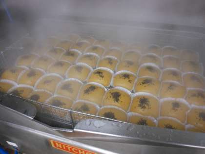 3年前の大震災を忘れないとして、福島県と岩手県の郷土料理を組み合わせました。「こづゆ」は、干し貝柱でだしをとるのが特徴です。また雁月は、黒砂糖味の黒ごまを散らした蒸しパンです。