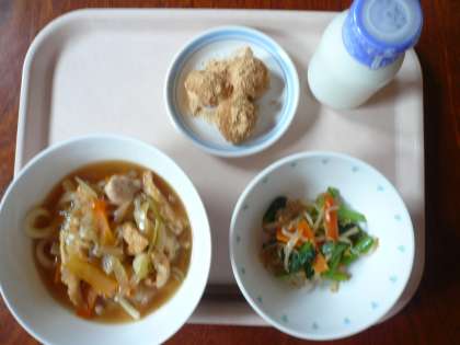 献立 鶏なんばんうどん 茹で野菜のごまじょうゆがけ 桜団子 牛乳